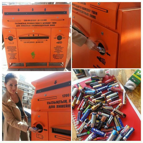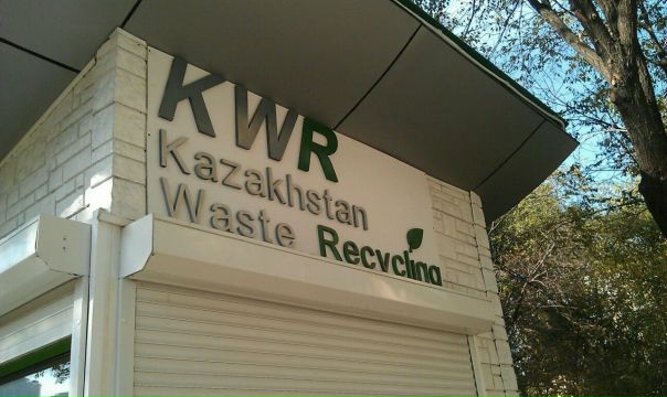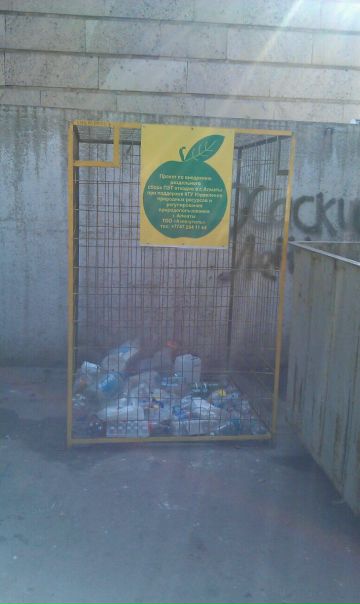 Табличка на контейнере гласит: «Проект по внедрению раздельного сбора ПЭТ отходов в г.Алматы при поддержке КГУ Управление природных ресурсов и регулирования природопользования г. Алматы ТОО «Азия-утиль», тел: +7 747 284 11 44.