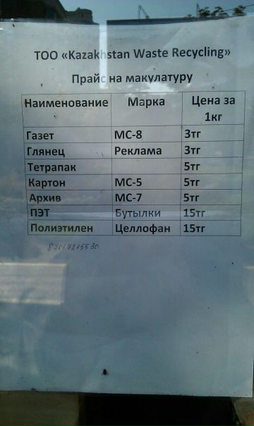 Это адрес небольшого ларька по приему пищевых пластиковых бутылок и пакетов. Помимо этого они занимаются переработкой газет, глянца, тетрапакетов, картона. Сама компания является крупнейшим производителем бумаги и упаковки из переработанного сырья в Казахстане и Центральной Азии. Кроме того, сдавая туда указанный в прайсе мусор, можно получить за него небольшую плату.